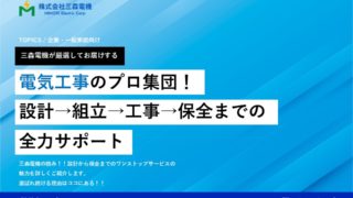 お仕事 電気工事のプロ集団!三森電機が実現する“設計→組立→工事→保全”までの全力サポート 福島県棚倉町の三森電機は、設計・組立・工事・保全を自社で一貫対応する電気工事のプロフェッショナル。工場やオフィスの電源工事、LED導入、省エネ提案から一般家庭の照明・エアコン設置まで幅広く対応。確かな技術力と地域密着のサポートで、安心と高品質をお届けします。 2025.09.22 お仕事
