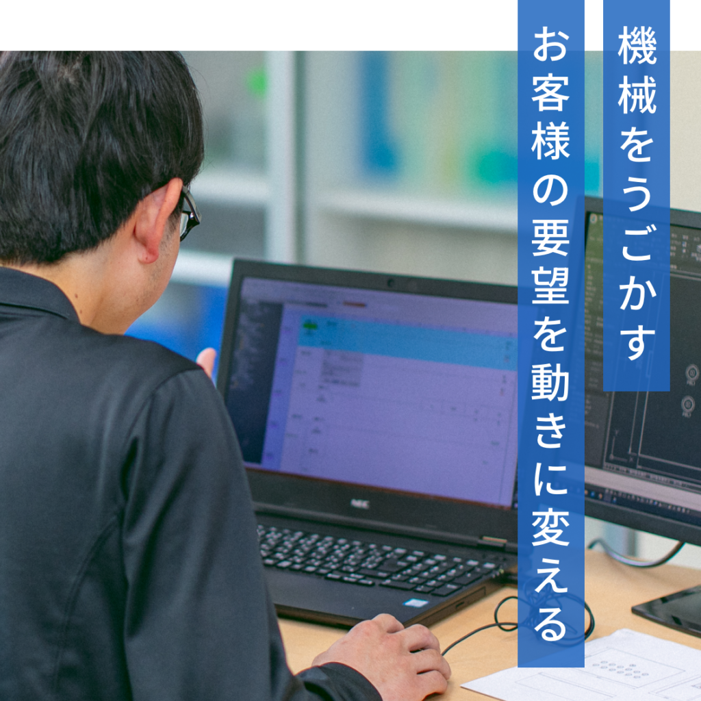 お客様のニーズをヒアリングし、制御盤の図面作成やPLCによるプログラム設計を行います。図面やソフトウェアを通して、機械に命を吹き込むクリエイティブな仕事です。